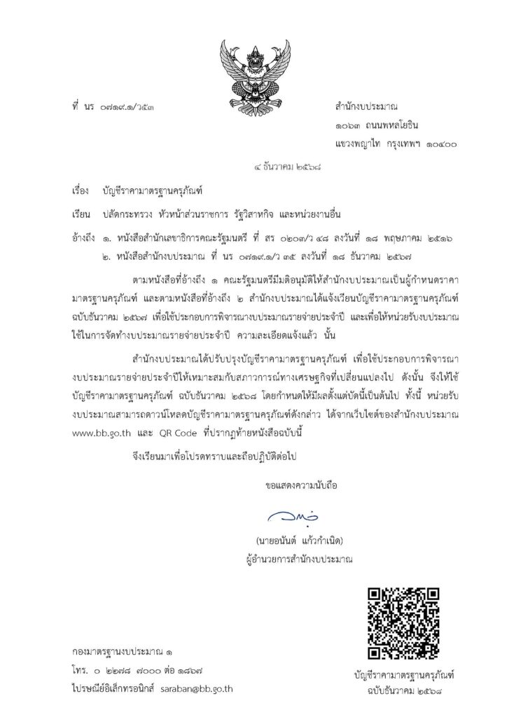 ตามหนังสือสำนักงบประมาณ ที่ นร ๐๗๑๙.๑/ว ๕๓ ลงวันที่ ๔ ธันวาคม ๒๕๖๘ แจ้งว่า สำนักงบประมาณได้ปรับปรุงบัญชีราคามาตรฐานครุภัณฑ์ เพื่อใช้ประกอบการพิจารณางบประมาณรายจ่ายประจำปีให้เหมาะสมกับสภาวการณ์ทางเศรษฐกิจที่เปลี่ยนแปลงไป ดังนั้น จึงให้ใช้บัญชีราคามาตรฐานครุภัณฑ์ ฉบับธันวาคม 2568 โดยกำหนดให้มีผลตั้งแต่บัดนี้เป็นต้นไป